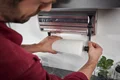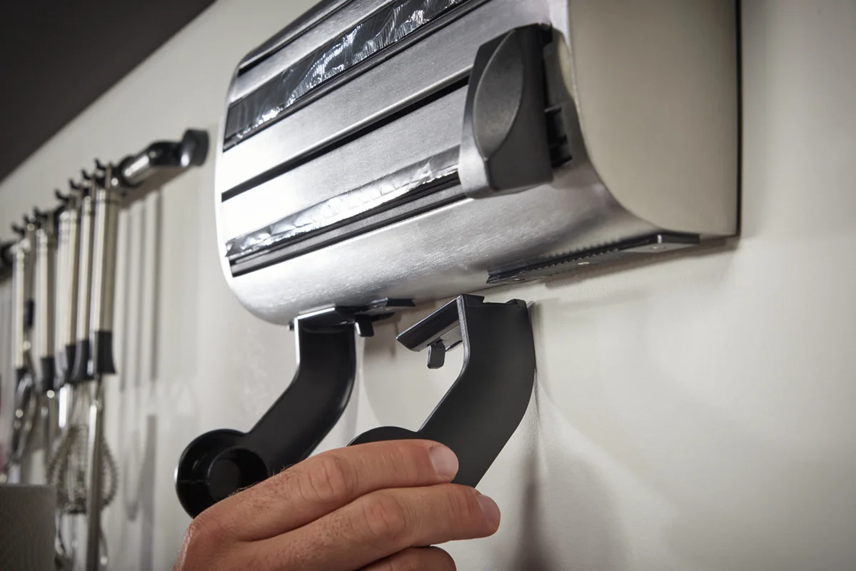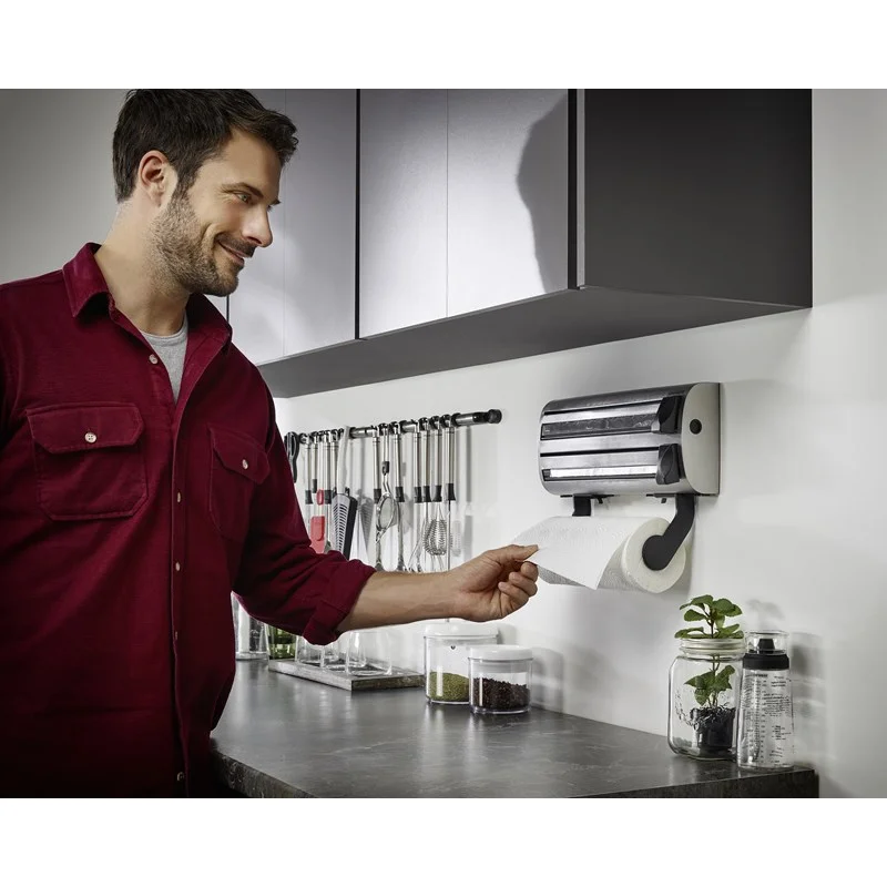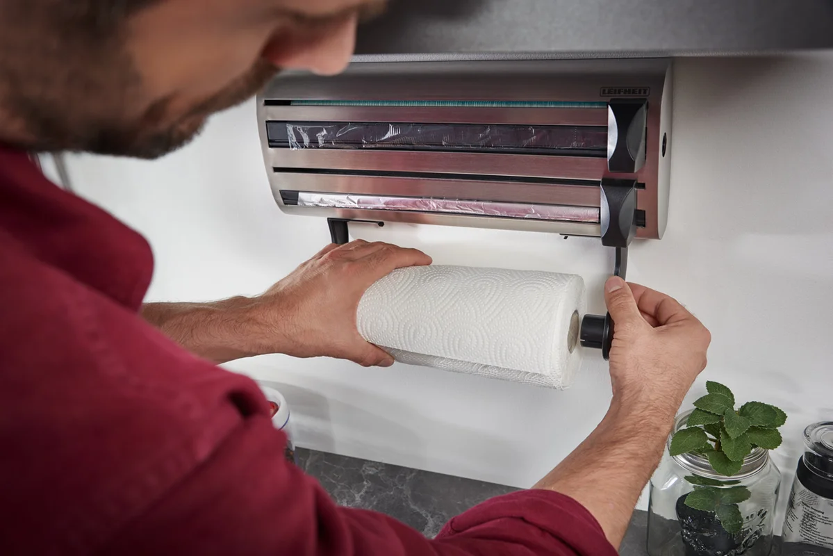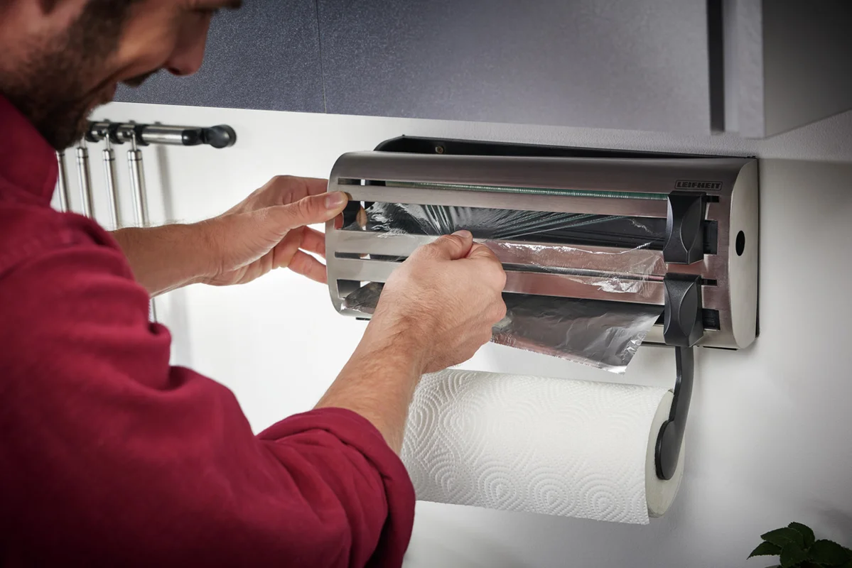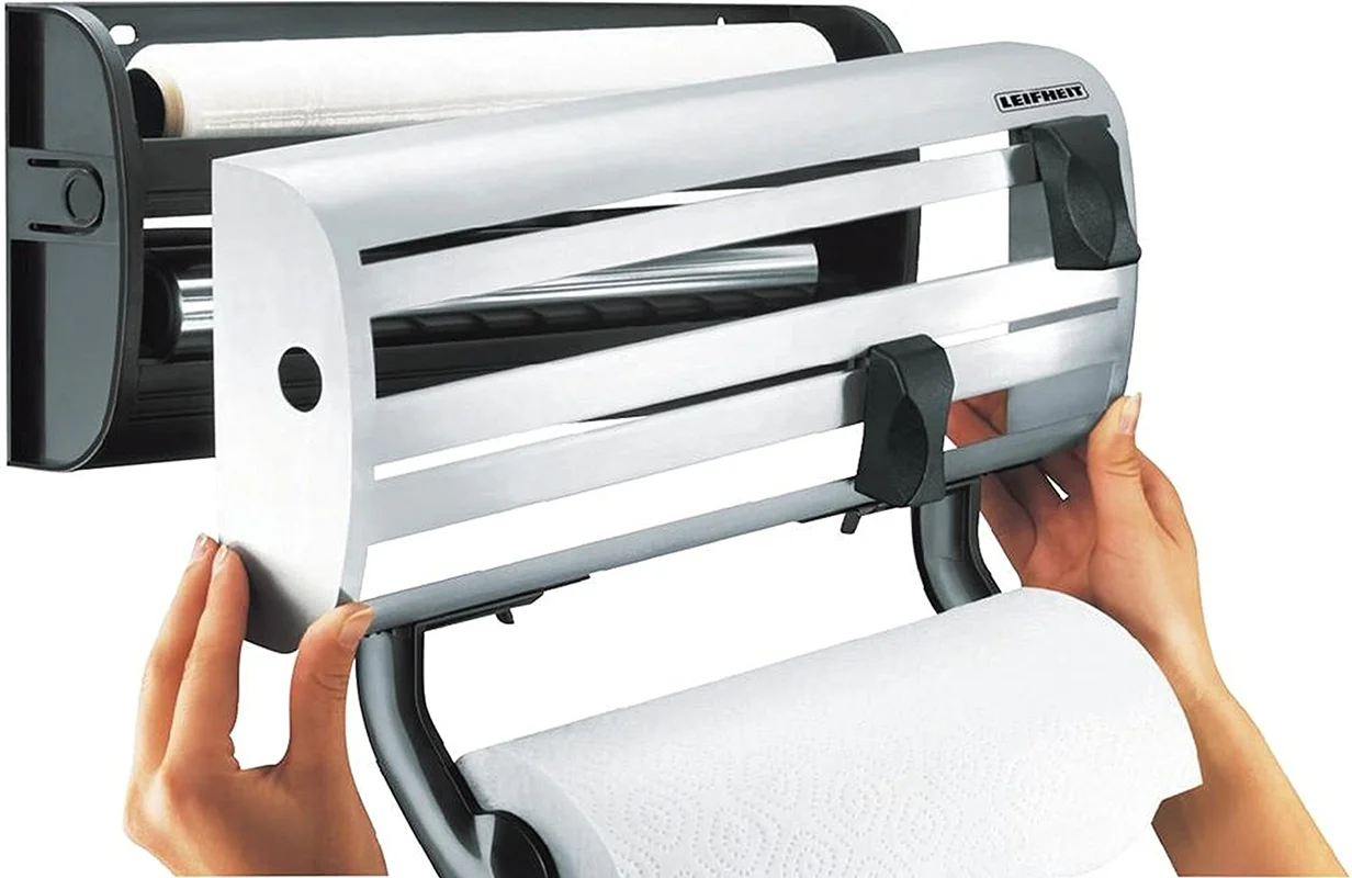امروزه استفاده از وسائلی که با ایده های ابتکاری باعث صرفه جویی در فضای اشغال شده و وقت ما می شوند بسیار متداول و به صرفه است. نگهدارنده مدل CLEVER لایف هایت دارای دو مخزن نگهداری فویل و سلفون بوده و با استفاده از برش زن برنده و متحرک به آسانی آنها را برش زده و لبه های تمیز و بدون کجی ارائه می دهد و همیشه لبه ها را برای برش بعدی در دسترس ما قرار می دهد. بازوهای نگهدارنده رول دستمال نیز قابلیت تنظیم داشته و برای سایزهای مختلف قابل استفاده هستند. برای پر کردن این وسیله کافیست رویه استیل آن را برداشته و رول ها را درمحل مشخص خود قرار بدهید.ایده ساخت این گونه نظم دهنده ها از طراحان لایف هایت شروع شده هر چند امروزه نمونه های مختلف آن با کیفت و قیمتهای متفاوت توسط دیگر سازندگان کپی و ارائه شده است.