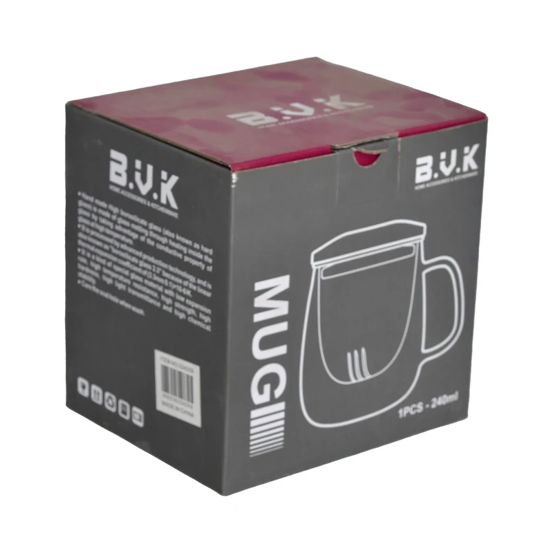 لیوان دمنوشساز بی وی کی کد 324209 با گنجایش 240 میلی لیتر ( 0.24 لیتر ) از دوجداره شیشه بوروسیلیکات ساخته شده است. لایهی بیرونی با فاصلهای حدود یک سانتیمتر از لایهی داخلی فاصله دارد. این فاصله وکیوم شده و حالت خلاء دارد. خلاء یکی از بهترین انواع عایق برای ایجاد قابلیت نگهداری دما برای فلاسکهای خانگی است. توانایی حفظ دما این امکان را به شما میدهد تا دمنوش دلخواهتان ساخته و میل کنید.